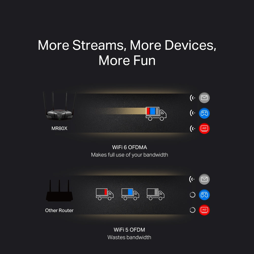 MORE DEVICES, MORE FUN – Supports MU-MIMO and OFDMA to reduce congestion and quadruple the average throughput.